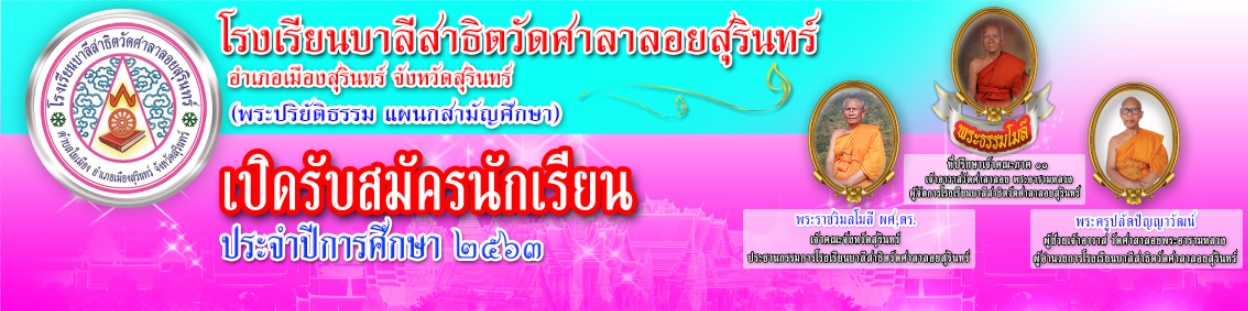 ขอเรียนเชิญเจริญพร ท่านพุทธศาสนิกชนผู้ใจบุญทุกท่าน โรงเรียนบาลีสาธิตวัดศาลาลอยสุรินทร์ ได้ดำเนินการก่อตั้งโรงเรียนมาเพื่อ สนับสนุนส่งเสริมการศึกษาของบุตรหลานชาวจังหวัดสุรินทร์ ให้ได้มีโอกาสทางการเรียน 6 ส.ค. 63